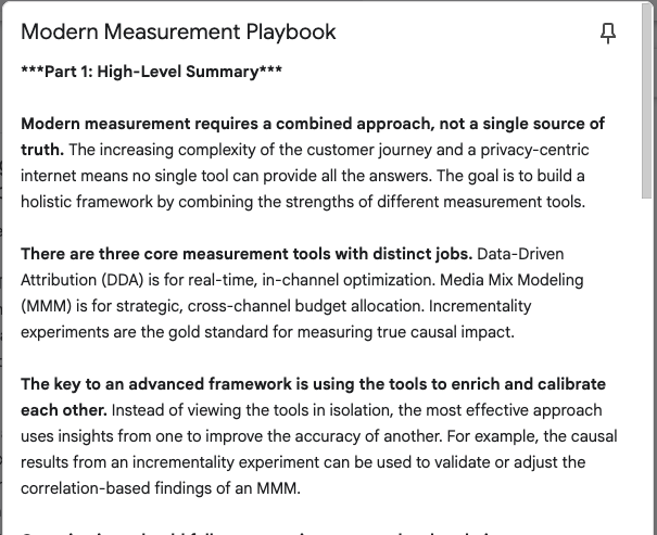 The Detailed Summary becomes my searchable archive. This is where the magic happens. Instead of generic takeaways, I get specific details like “Creatives drive 60% of digital marketing effectiveness” or “Attribution ROAS should be calibrated against MMM results using incrementality testing.” These details are what make the difference when I’m hunting for proof points months later while building a report or deck.