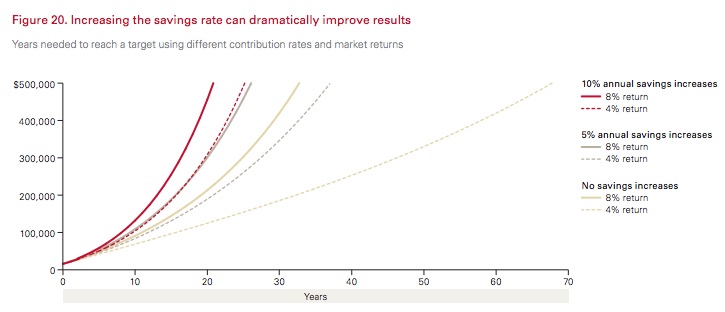 Next, notice that getting an 8% return while increasing contributions by 5% a year (the solid grey line) produces almost the same result as getting a 4% return while boosting contributions by 10% a year (the dashed red line). Yet, the investor who got the 8% return likely took on a whole lot more risk than the investor who got the 4% return. By simply increasing your contribution rate, you can get the same results with lower risk, even with a lower overall return.