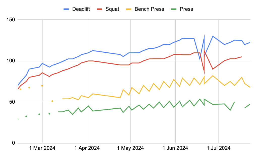 You can see the drops in my squat and deadlift weights in mid-June, when I started failing sets. The bench press and press also followed a zigzag pattern because Shaun gave me lighter weights in alternating weeks.